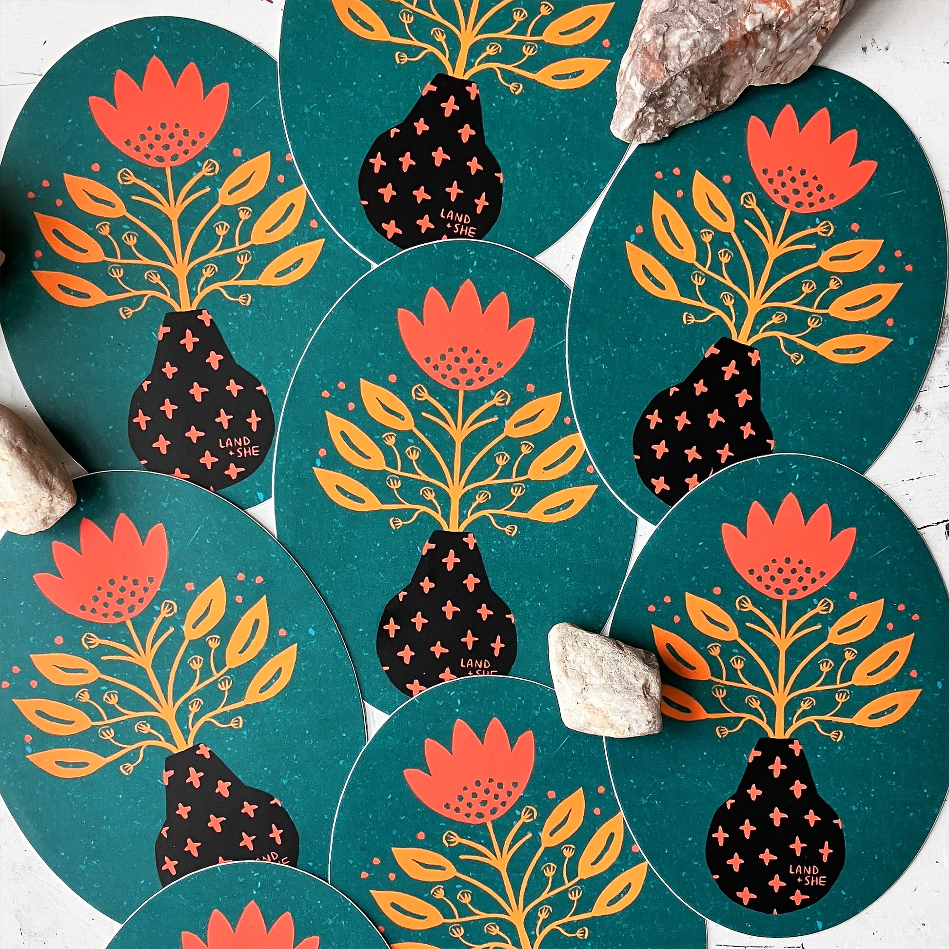 One 3″ × 4″ inch sticker inspired by folk art. Digitally hand-drawn illustration. Thick, durable vinyl protects stickers from scratches, water & sunlight.