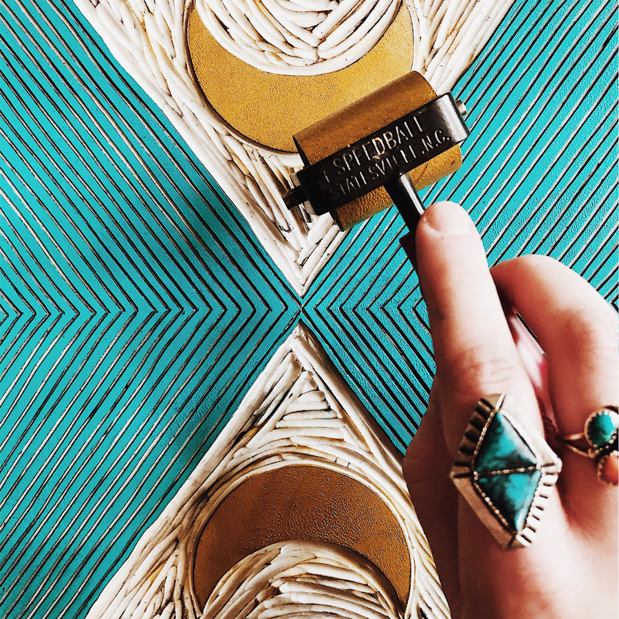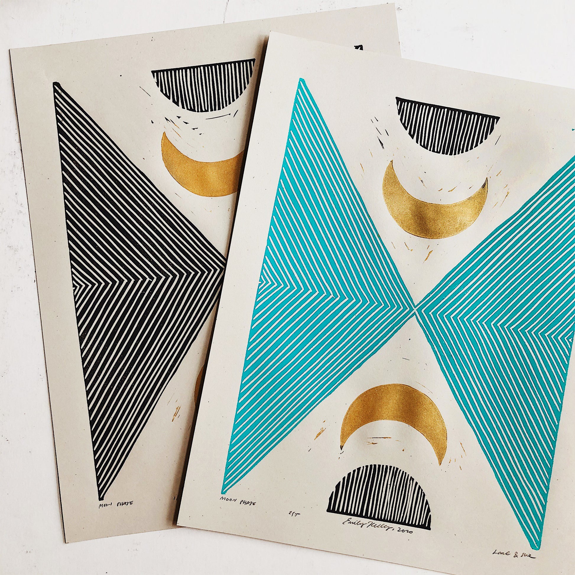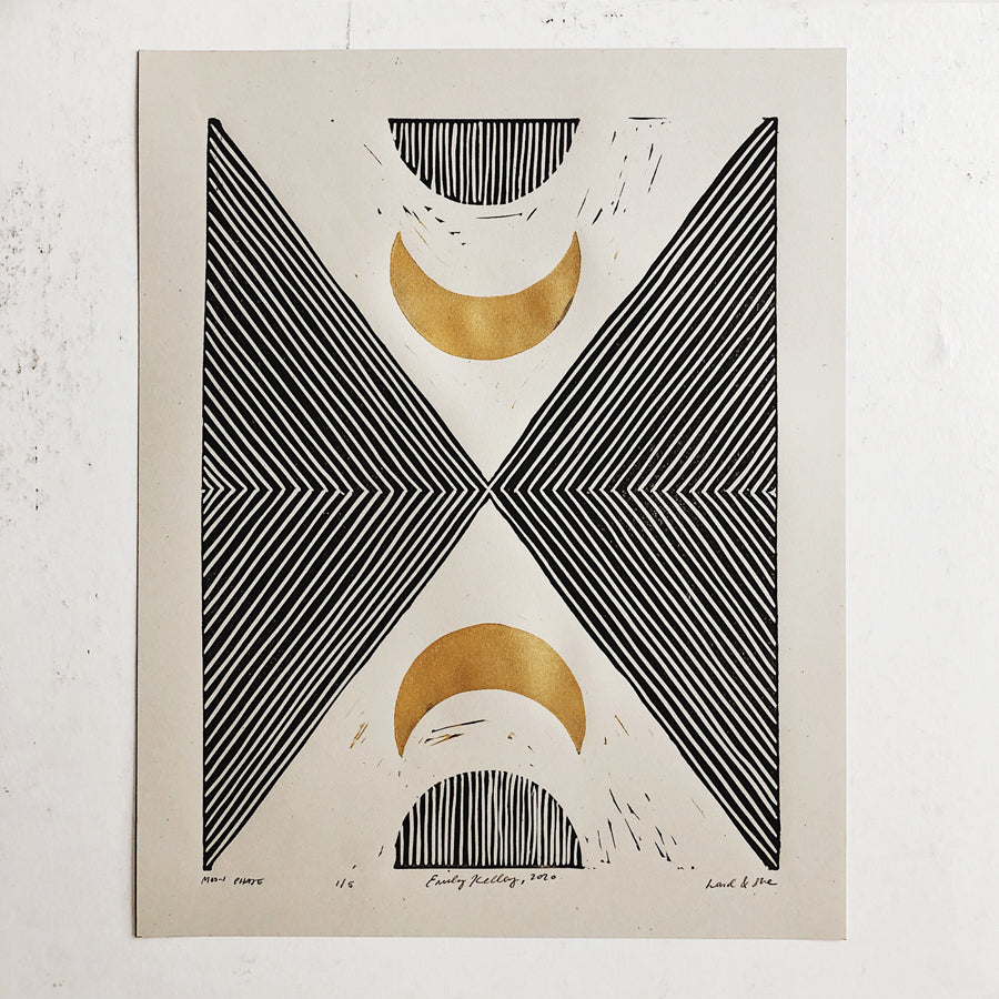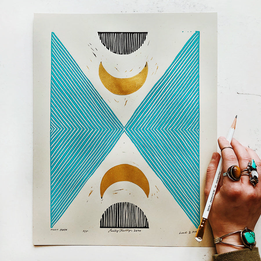 One of our bestsellers in the shop, this Moon Phase print is a new take on our Subterranean print series, but incorporating a striking golden moon and turquoise ink. Handmade from a carved linoleum block.