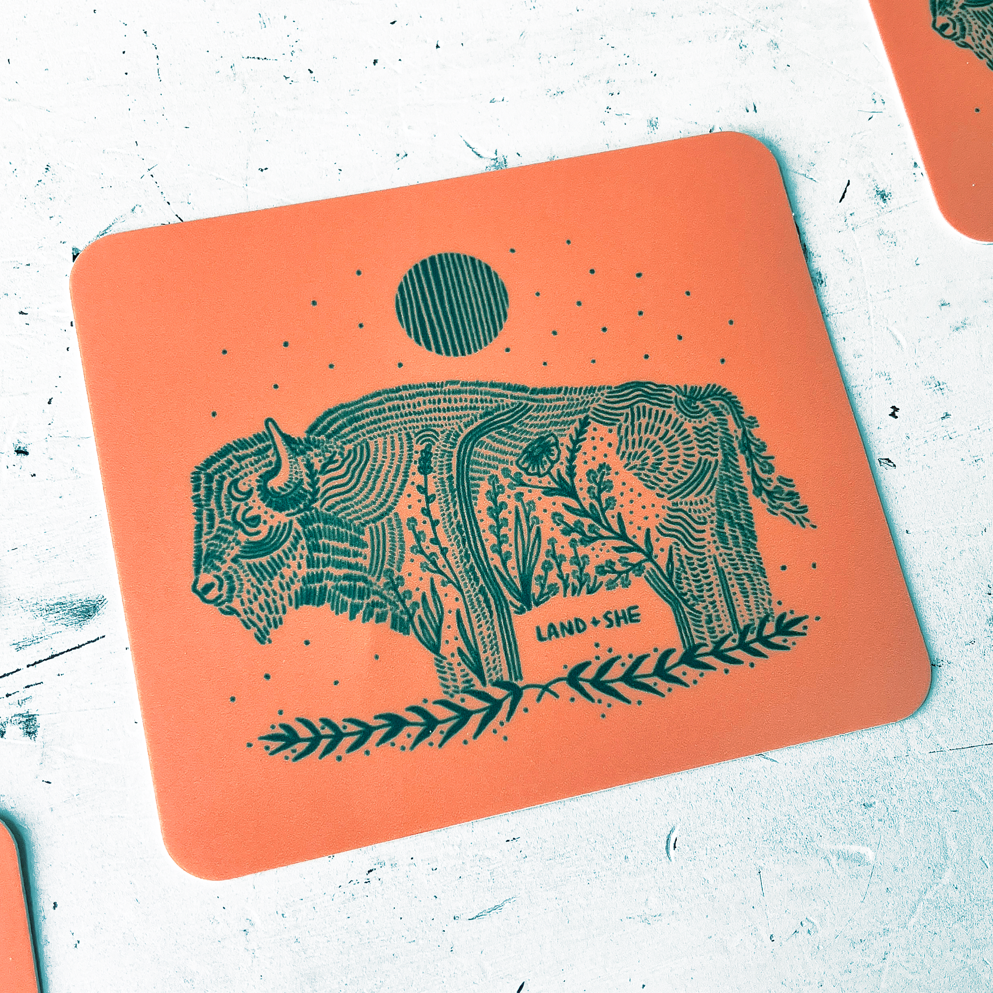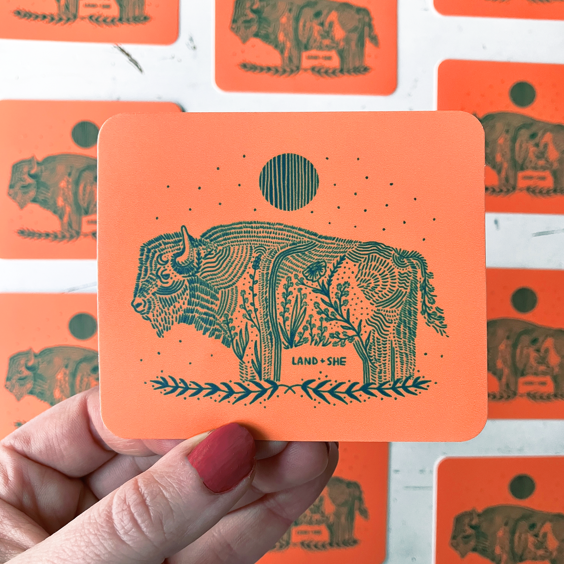 One 3.5″ × 3″ inch sticker inspired by a bison on the prairie. Digitally hand-drawn illustration. Thick, durable vinyl protects stickers from scratches, water & sunlight.